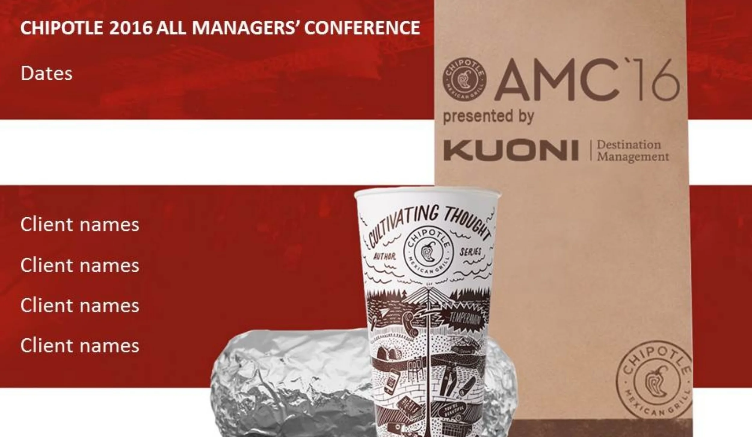 This blank template for a proposal to host the Chipotle™ Annual Corporate Conference was conceptualized and created from scratch by Matthew Macri. This presentation won the bid for Kuoni Destination Management™.